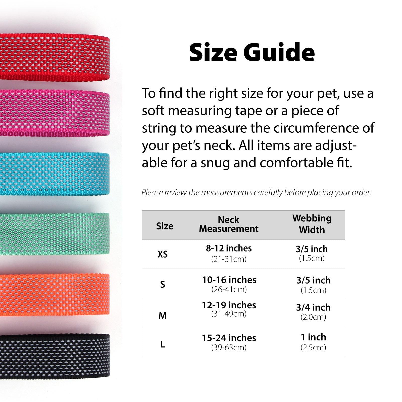 XS: Neck 8-12 inches, Width 3/5 inch S: Neck 10-16 inches, Width 3/5 inch M: Neck 12-19 inches, Width 3/4 inch L: Neck 15-24 inches, Width 1 inch