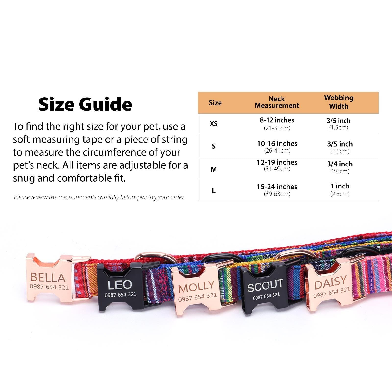 XS: Neck 8-12 inches, Width 3/5 inch S: Neck 10-16 inches, Width 3/5 inch M: Neck 12-19 inches, Width 3/4 inch L: Neck 15-24 inches, Width 1 inch